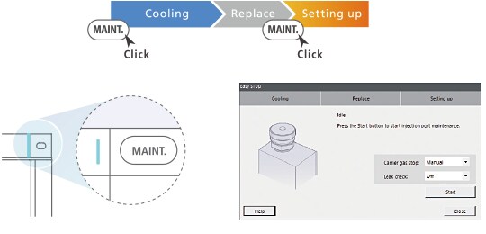 The GC-2050 is equipped with a function (Easy sTop) that automatically lowers the GC inlet temperature and simplifies liner (consumable) replacement by simply pressing the MAINT. button on the upper right of the GC front panel. It can also be operated from the OpenLab window, helping to ensure a convenient workflow in the lab.