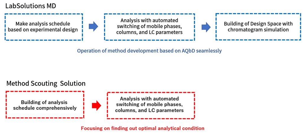 LabSolutions™ MD improves method development efficiency by taking an Analytical Quality by Design (AQbD) approach. This software efficiently develops highly reliable analysis methods by configuring mobile phases, columns, and other parameters using an analysis function that automatically generates analysis schedules with the experimental design method and a data analysis function that plots a design space and predicted chromatogram.